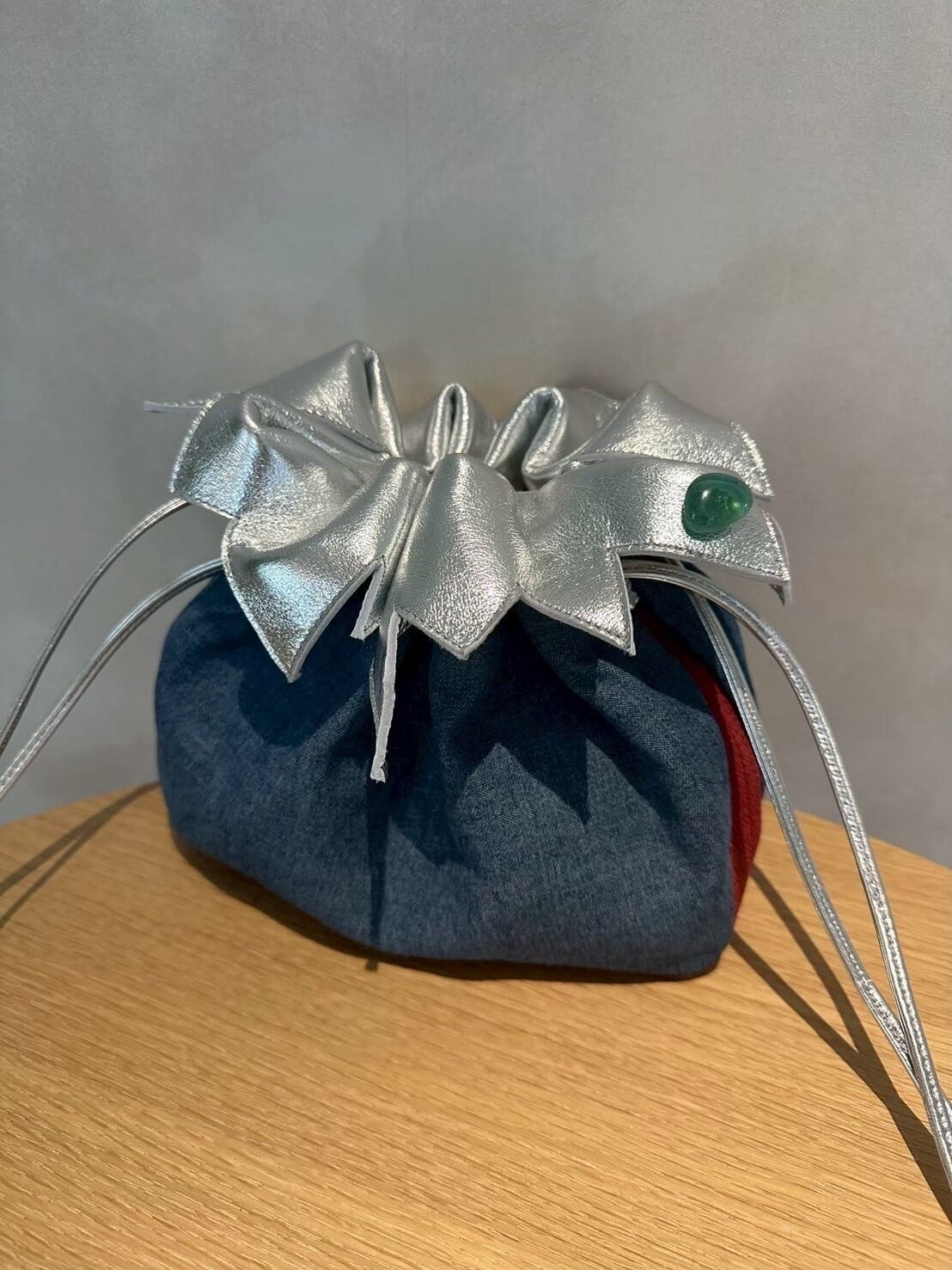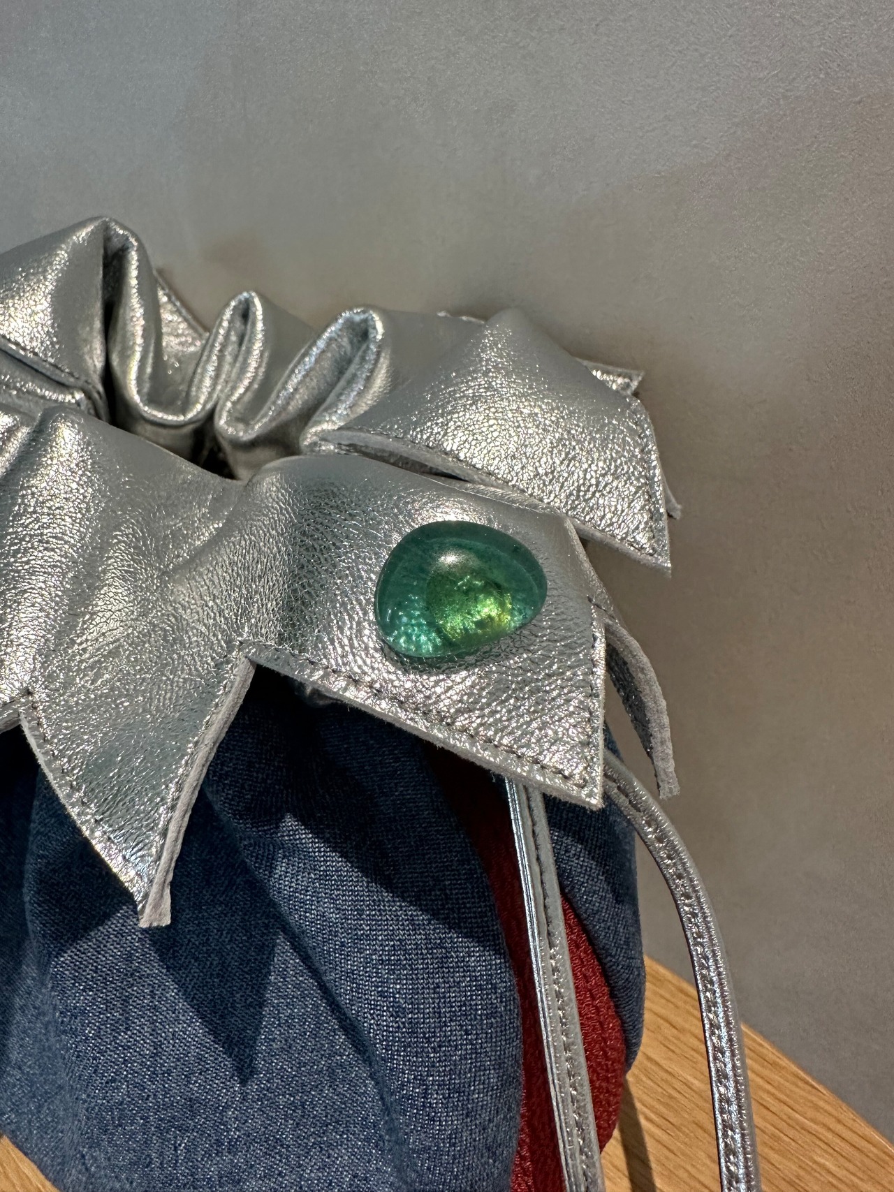 It's a sophisticated design that combines premium **Spanish lambskin**, high-quality **Japanese denim**, and traditional **Japanese kimono obi**. Adding to its unique charm, each piece is accented with **handcrafted sea glass** that glimmers and shines in the light. This is a bag that elevates your everyday life and brings out your unique appeal.